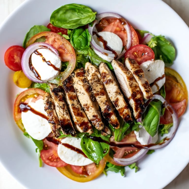 The beauty of Caprese anything is that it's built on contrast—warm and cool, creamy and fresh, tangy and sweet. This version takes that beloved flavor combination and makes it substantial enough to be a real meal instead of a side. The grilled chicken brings warmth and smokiness, the mozzarella brings richness without heaviness, and the basil reminds you why you love eating in summer. Everything supports everything else.