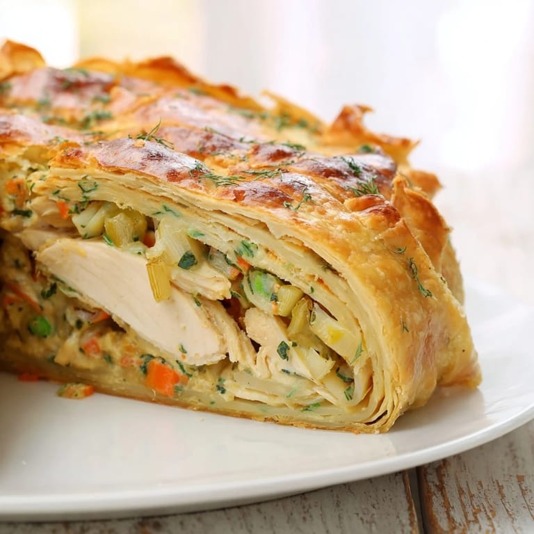 Pin it A rustic, comforting chicken pot pie infused with aromatic bay leaf and fresh herbs, nestled beneath a golden, flaky pastry crust. Perfect for cozy dinners and family gatherings.