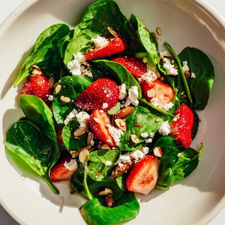 Pin it There's something about spring that makes me crave bright, simple things, and this salad showed up in my kitchen almost by accident one afternoon. I'd bought strawberries at the farmer's market thinking I'd bake something, then caught myself standing in front of the fridge with a bunch of fresh spinach in one hand and those ruby-red berries in the other. What if I just tossed them together? The first time I made it, the combination of sweet fruit against peppery greens felt like a small revelation, especially when the balsamic hit my tongue with that subtle tang.