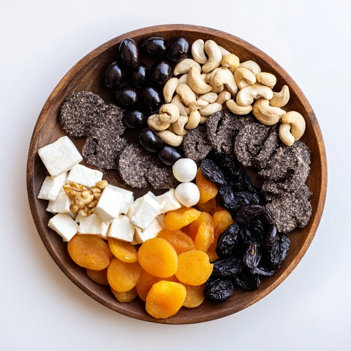 - Now create visual harmony on the opposite half with your white cheese—slice it into pieces or leave small cubes for texture variation. Add the rice crackers, spacing them so they're accessible but don't overwhelm the cheese. Tuck in the cashews or almonds, letting them cluster slightly for richness, then distribute the dried apricots or white grapes, creating warm and cool spots across the half. The honey drizzle comes last, just a few threads across the cheese to catch light and add shimmer.